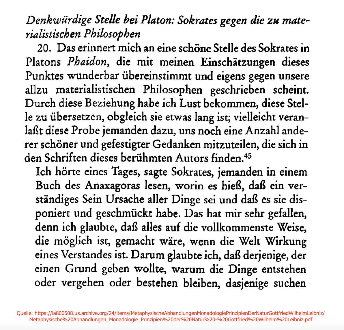 Gottfried Wilhelm Leibniz war ein Universalgelehrter der Zeit nach dem verheerenden Dreißigjährigen Krieg. Das heisst, er verfügte über eine außerordentlich breite und ebenso fundierte Bildung. Mehr noch: Leibniz war ein Befürworter der sokratischen Methode Platons, um mittels Bildung den Wiederaufbau durch technischen Fortschritt zum Wohle aller und zum Ruhme Gottes zu verwirklichen. In seinen ‘Metaphysischen Abhandlungen’ zitiert Leibniz Platon sogar ausführlich hinsichtlich der Notwendigkeit, die Gesetze des Kosmos zu erforschen. Leibniz ist sich mit Platon in der Ablehnung einer materialistischen Philosophie einig: